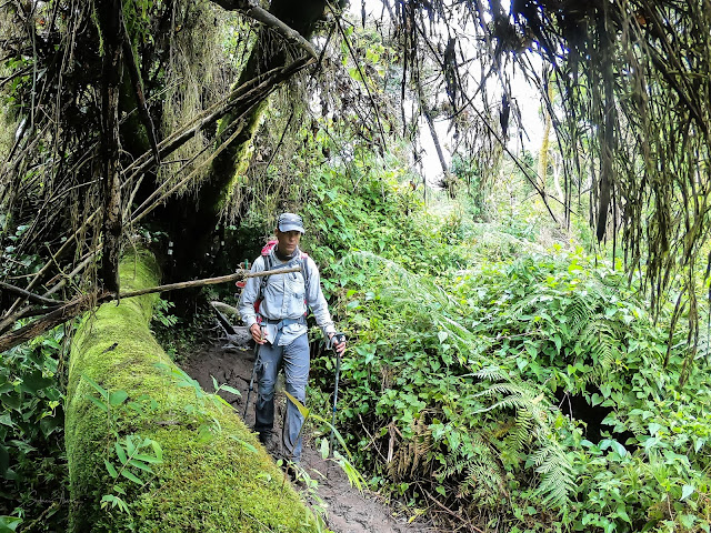 Pouco depois atingi o cume do Camapuã, envolto em densa neblina. Nesse trecho encontrei dois rapazes que subiam juntos, também com destino ao Tucum, bem como um cara sozinho, acompanhado do seu cachorro. Logo o reconheci de alguns vídeos que havia visto meio aleatoriamente no Youtube, em algum momento recente. Perguntei e ele confirmou. Era o Lucas Glimm, do canal "Sozinho na trilha", dedicado a contar histórias de caminhadas e investidas em diversas trilhas de matas e montanhas da região sul do Brasil, sempre sozinho. Interessante esse encontro casual e essa conexão com um conteúdo compartilhado nessa plataforma gigante de vídeos. Batemos um papo rápido sobre o trabalho que ele desenvolve, parabenizei-o e segui meu caminho em direção ao destino pretendido do dia, o Pico Tucum, situado logo adiante, mas separado do Camapuã por um acentuado declive seguido de um igualmente acentuado aclive na sequência.